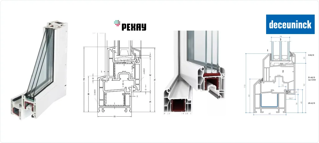 Под заказ выполняется декорирование методом каширования или нанесения ламинационной пленки любого оттенка. Линейка включает серию с дизайнерской рамой с закругленными линиями. У конкурента – более разнообразная линейка профильных систем. Профили Deceuninck.