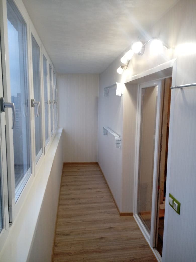 Выполненные работы: Остекление лоджии профилем REHAU Grazio, Утепление и отделка ламинированными панелями, Проводка электрики и установка светильников, Вывоз мусора