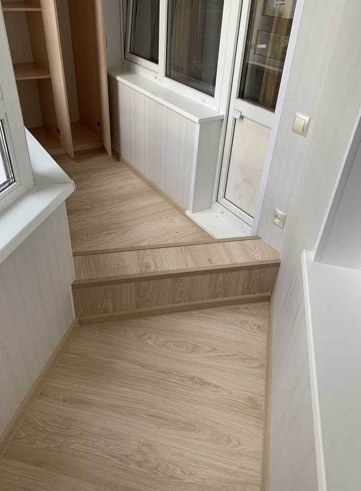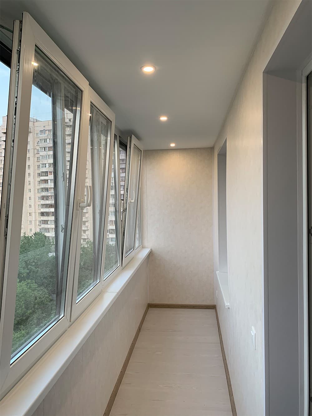 Выполненные работы: Остекление лоджии профилем REHAU Grazio, Утепление и отделка ламинированными панелями, Проводка электрики и установка светильников, Вывоз мусора