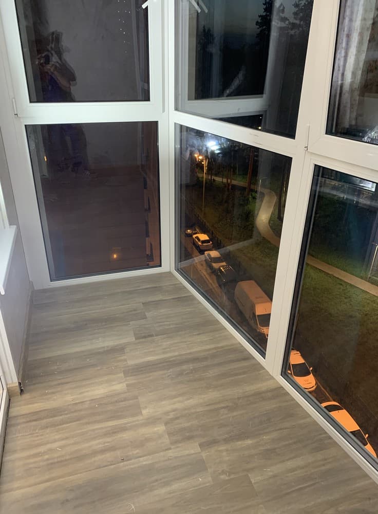 Выполненные работы: Остекление лоджии профилем REHAU Grazio, Утепление и отделка ламинированными панелями, Проводка электрики и установка светильников, Вывоз мусора